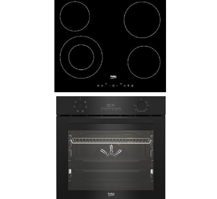 Ugradni set rerna i ploča, Beko rerna BBIE123001BD (Ugurni izvlačni dugmić, 6 funkcija kuvanja, 72l zapremina) + Beko ploča HIC 64402 T (4 staklokeramičke ringle, Ploča gorionika: Staklo, Indikatori preostale toplote)