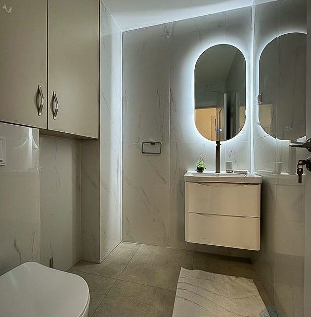 Struktura stana: hodnik, dnevni boravak, trpezarija, kuhinja, 2 spavaće sobe, 2 kupatila i terasa.