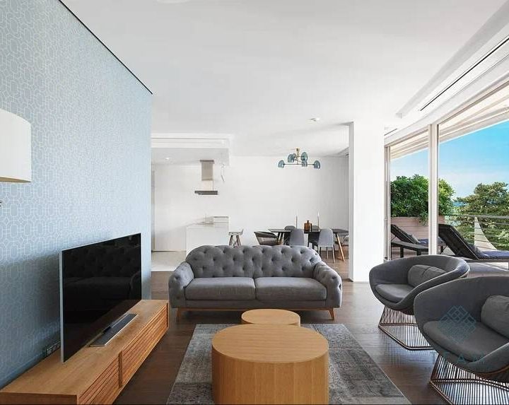 Apartman uključuje veliku dnevnu sobu, potpuno opremljenu kuhinju, 2 spavaće sobe i 3 kupatila. Panoramski prozori, visoki plafoni, predivan pogled na more i Svetog Nikolu – sve to su izuzetne karakteristike ovog apartmana.