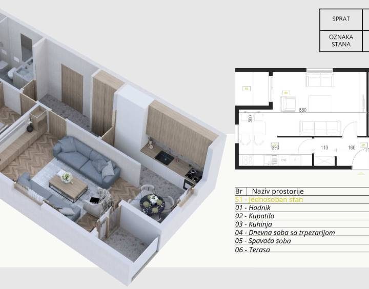 Struktura stana: hodnik, dnevni boravak sa trpezarijom, kuhinja, spavaća soba, kupatilo i terasu.