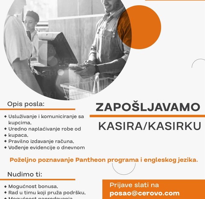 Kompanija Cerovo potražuje kasira/kasirku u svom prodajnom centru na Zabjelu. Poželjno iskustvo.