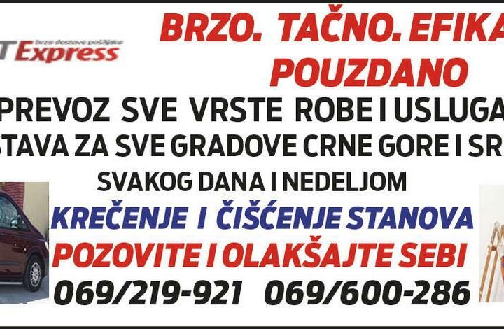 BRZO. TAČNO. EFIKASNO. POUZDANO. Prevoz svih vrsta robe i usluga. Dostava za sve vrste gradova Crne Gore i Srbije. Radimo svakog dana i nedeljom. Tel. 069/219-921 069/600-286