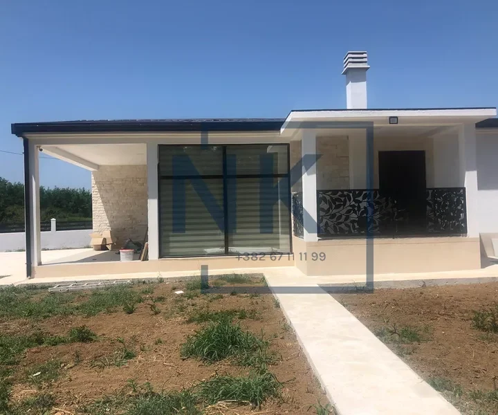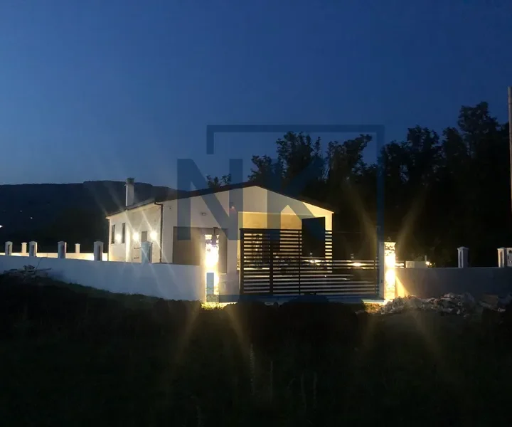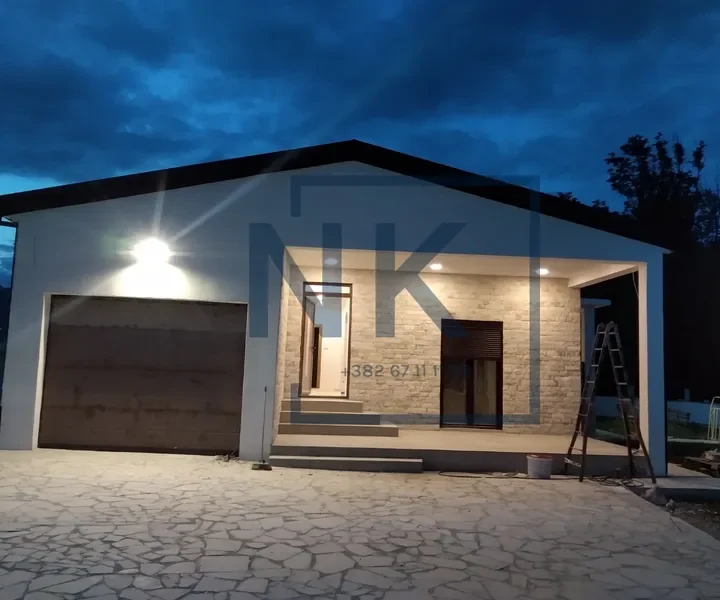 Struktura kuće: Ulazni hodnik, dnevni boravak povezan s trpezarijom i kuhinjom, dvije spavaće sobe, kupatilo, toalet, garaža i terasa.