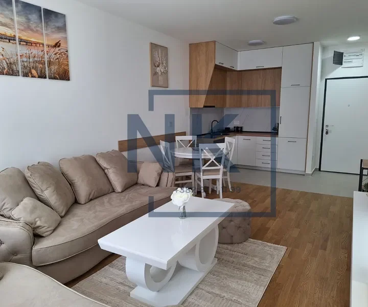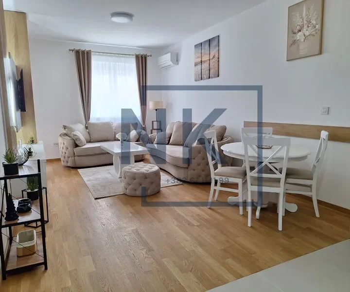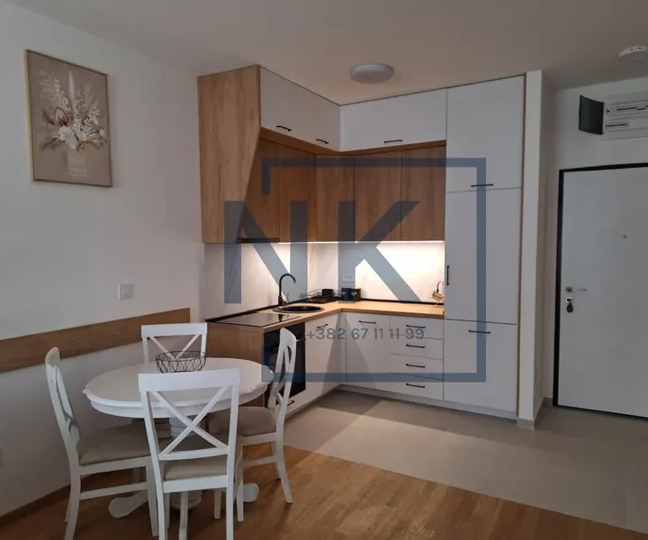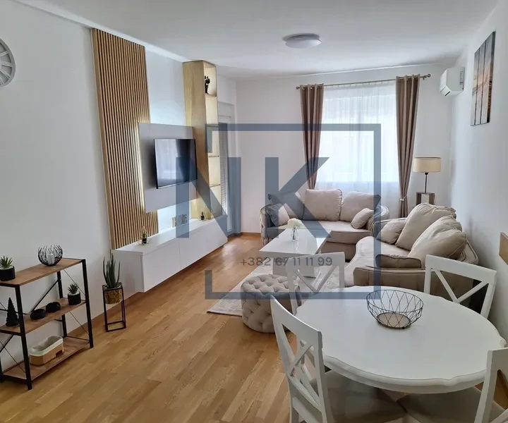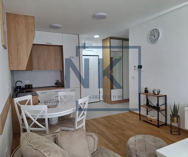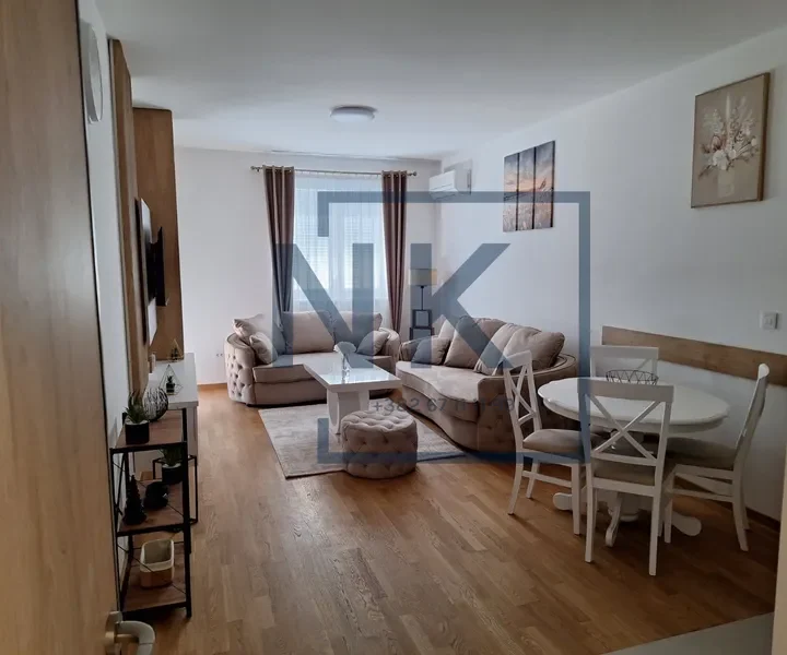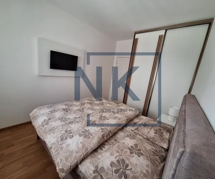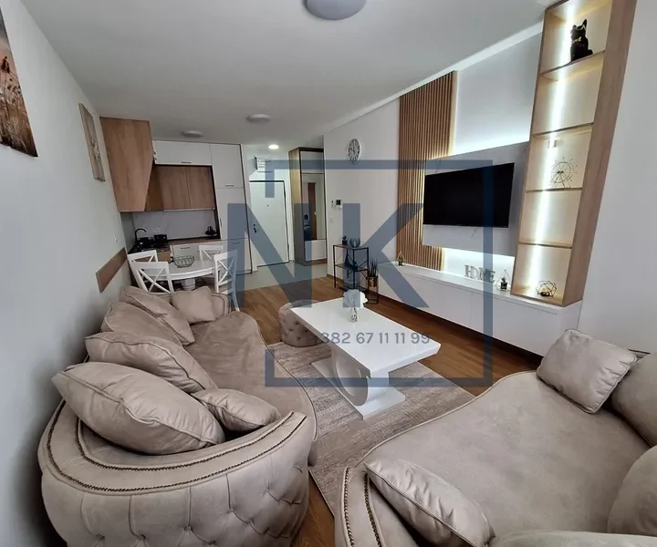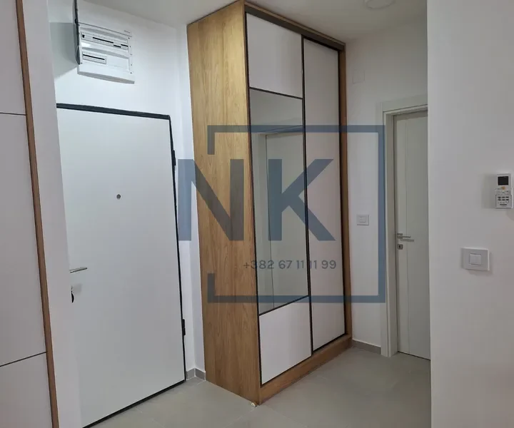 Raspored stana obuhvata dnevni boravak, trpezariju i kuhinju kao jednu funkcionalnu cjelinu sa izlazom na terasu 10m2, spavaću sobu, hodnik i moderno kupatilo. Luksuzno je opremljen — sav namještaj i kuhinja rađeni su po mjeri, a stan je opremljen kvalitetnom tehnikom. Izdaje se potpuno namješten, sa svim što je potrebno za udoban život.