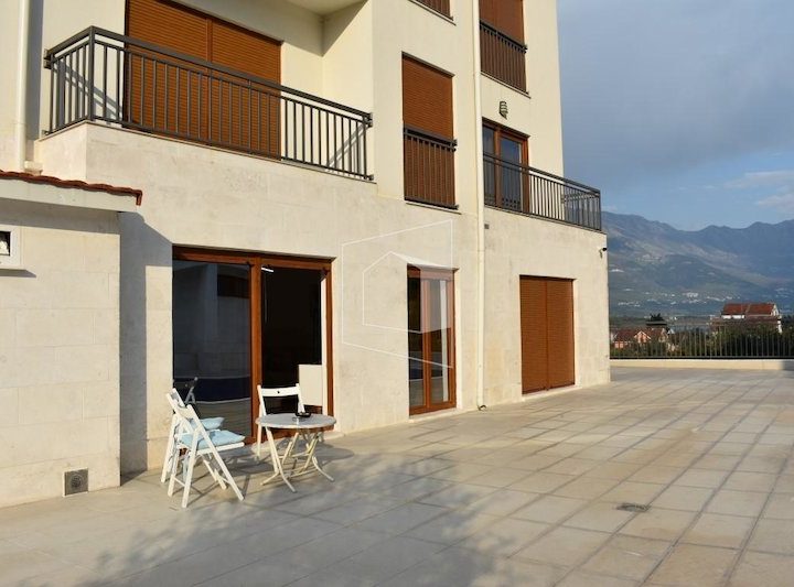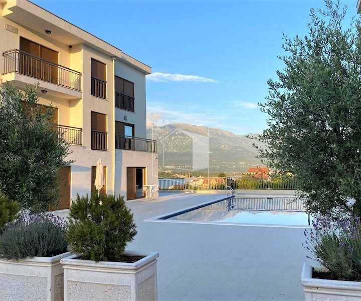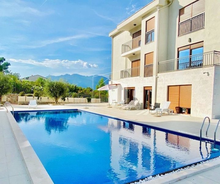 Stambena zgrada, u kojoj se nalazii stan udaljena je 5 minuta od glavnog kružnog toka KO-TV, posjeduje privatni bazen, okružen maslinama. Ispred zgrade nalazi se parking, gdje uvijek ima slobodnih mjesta.