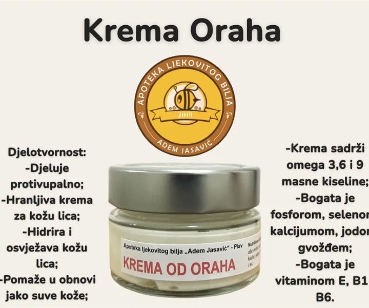 ↪️Osobine: Hidrantna krema dobijena od ulja oraha, procesom hladnog cijeđenja. Hidrantna krema oraha štiti kožu zahvaljujući svom antibakterijskom, antioksidativnom i antiinflamatornom dejstvu. Antioksidanti pokazuju potencijal u smanjenju linija i bora na koži, pomažući da koža izgleda mlađe.Antibakterijsko delovanje pomaže u zaštiti kože od patogena, koji su u stalnom kontaktu sa najvećim organom-kožom. ✅️