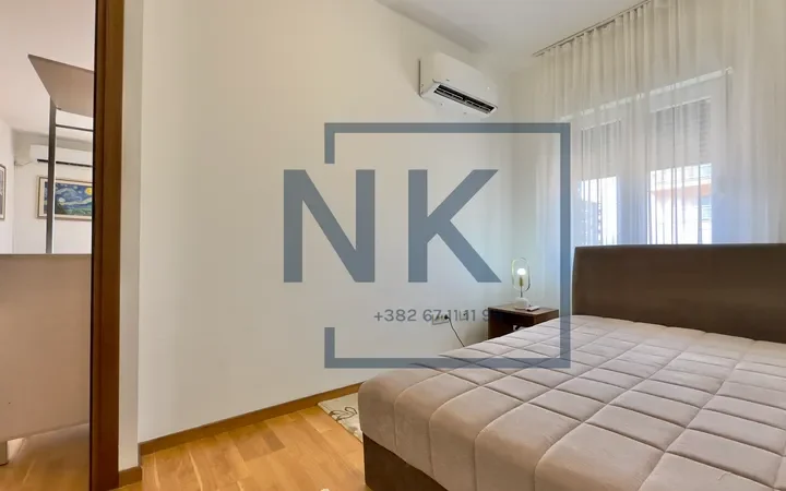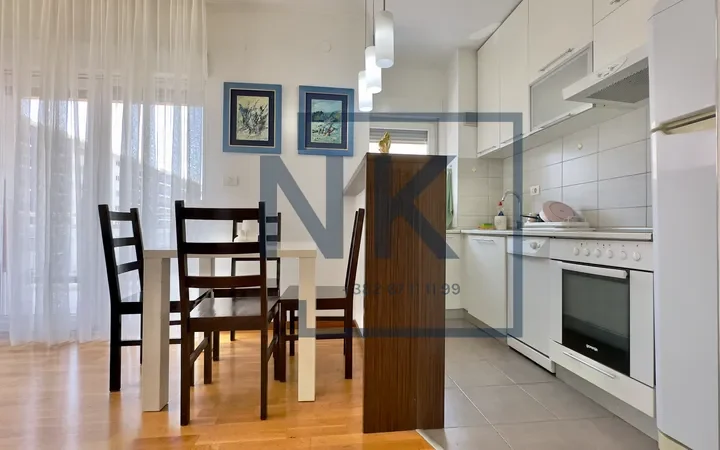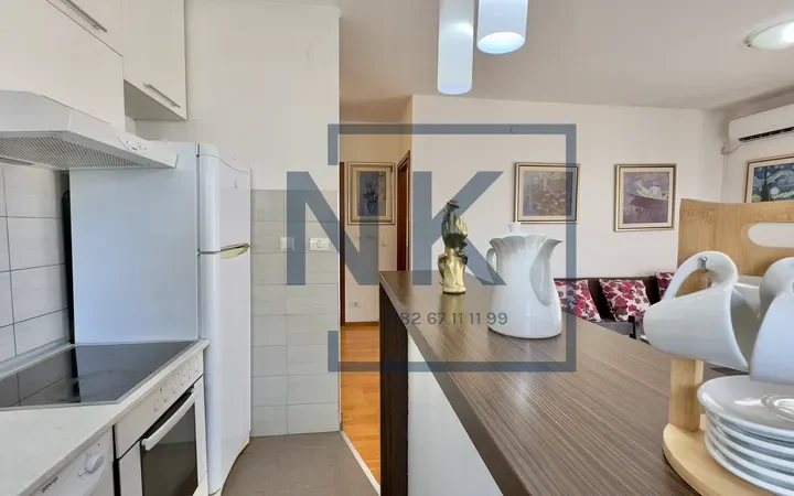 Stan je potpuno opremljen i namješten, sa klimom u svim prostorijama i podnim grijanjem u kuhinji i kupatilu. Kuhinja je opremljena svim potrebnim aparatima, uključujući mašinu za pranje posuđa.
