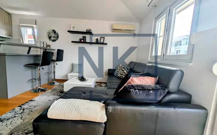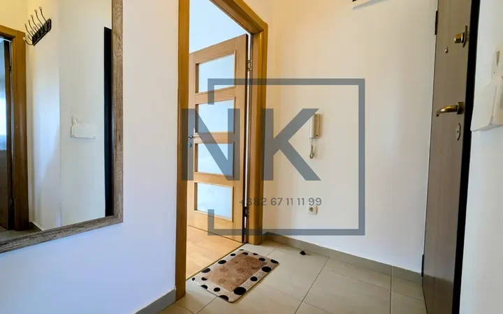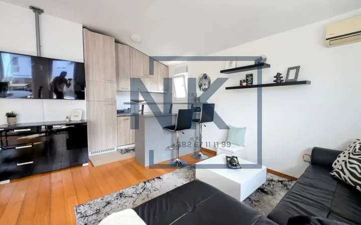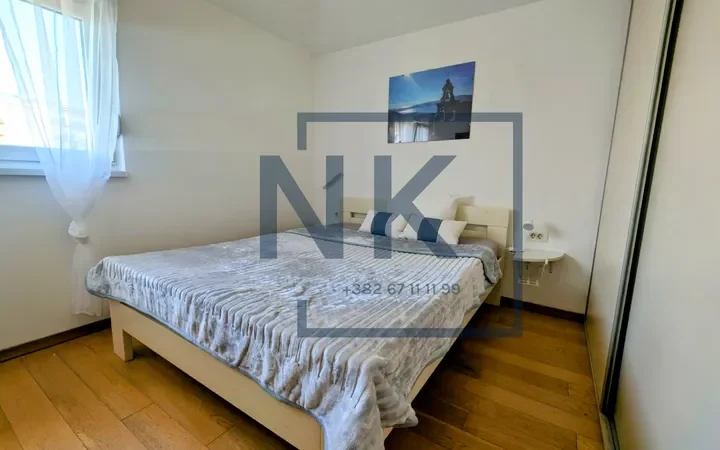 Nalazi se na trećem spratu manje stambene zgrade novije gradnje. Stan je lijepo organizovan i funkcionalan – sastoji se od ulaznog hodnika, dnevnog boravka sa trpezarijom i kuhinjom kao jednom cjelinom, sa izlazom na terasu, spavaće sobe i kupatila.