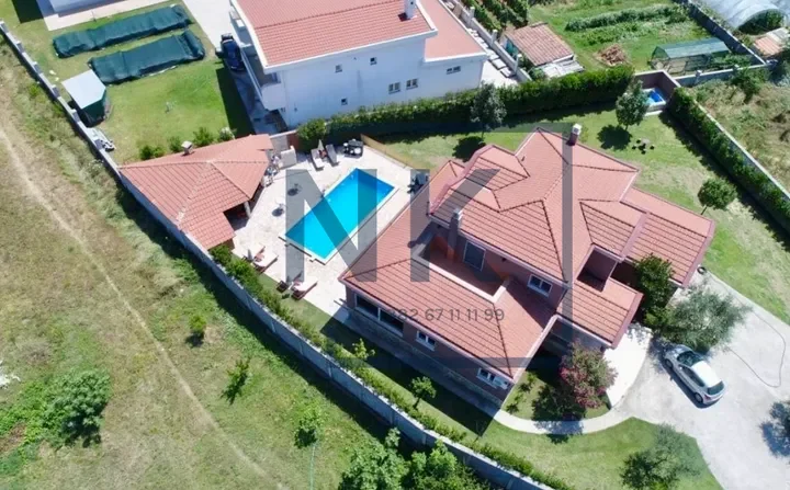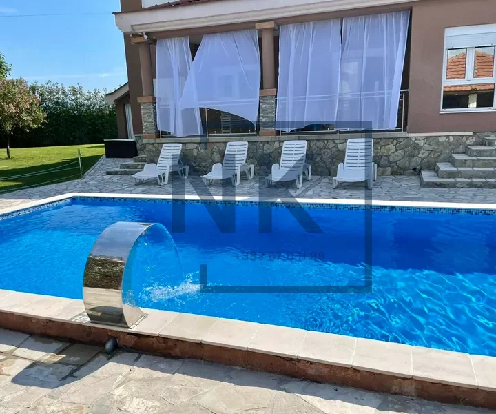 Eksterijer ove vile odiše luksuzom – bazen dimenzija 9×4 m sa sistemom konstantnog protoka vode, ljetnikovac od 50 m² sa roštiljem, toaletom i tuševima, idealan za okupljanja i uživanje na otvorenom. Cijelo imanje je ograđeno betonskom ogradom visine 2 metra, a električna kapija na daljinsko upravljanje i sistem video nadzora obezbjeđuju potpunu sigurnost.