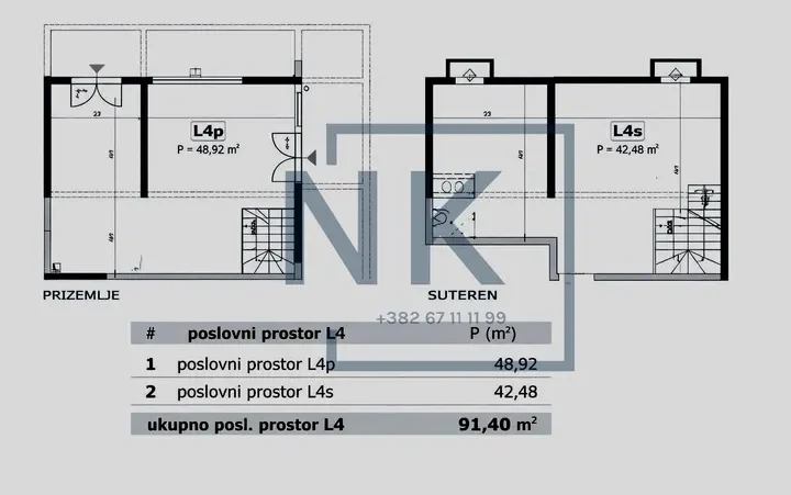 Prostor se sastoji od prizemlja površine 49 m² i suterena površine 43 m², što omogućava funkcionalnu organizaciju poslovanja – prizemni dio je idealan za izložbeni ili prodajni prostor, dok se suteren može koristiti kao magacin, kancelarijski dio ili dodatni radni prostor.