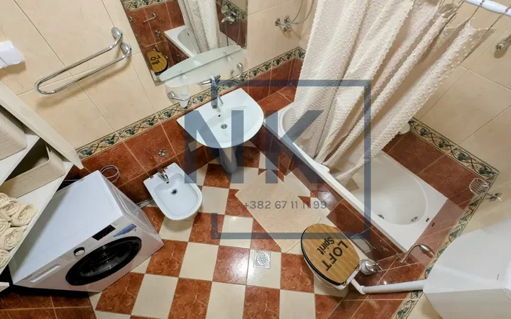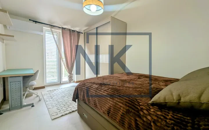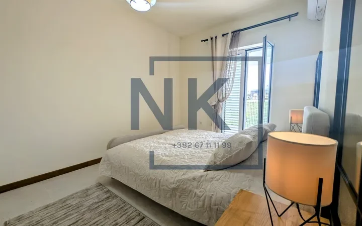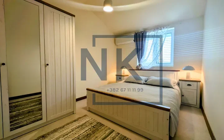 Stan odiše toplinom i stilom, pažljivo renoviran i kompletno opremljen novim namještajem i uređajima. Prostran i funkcionalan raspored nudi savršen balans između zajedničkih i privatnih zona. Ulazni hodnik vodi ka otvorenom dnevnom boravku povezanom s trpezarijom, dok je kuhinja, iako povezana s trpezarijom, diskretno odvojena staklenim vratima. Iz dnevne sobe se izlazi na veliku, komfornu terasu – idealnu za uživanje u kafi ili večernjem odmoru. U ovom dijelu stana nalazi se i dodatno, manje kupatilo sa tuš-kabinom, kao i praktična ostava.