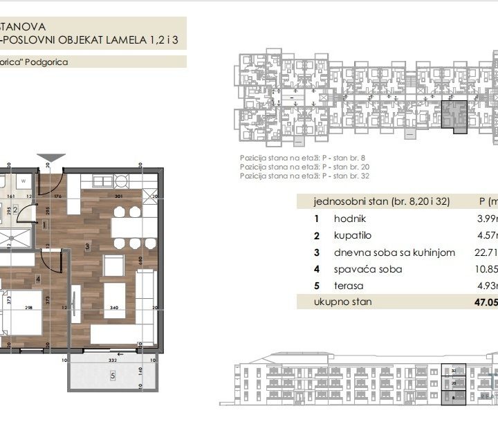 Na prodaju je stan površine 47,05 m², smješten na prvom spratu moderne zgrade u izgradnji, u okviru stambenog kompleksa Donja Gorica Residence u Podgorici.