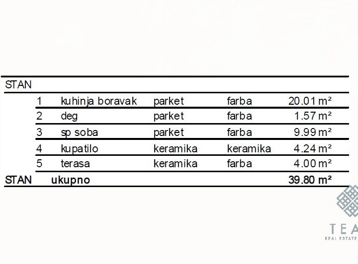 Stan ima funkcionalan raspored i sastoji se od ulaznog hodnika, dnevnog boravka sa trpezarijom, kuhinje, spavaće sobe, kupatila i terase.