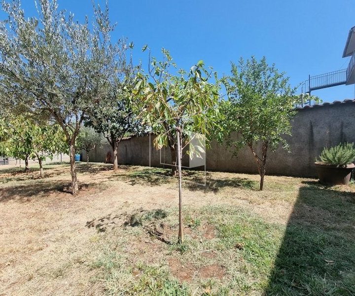 Zadnja strana dvorišta je ograđena visokom betonskom ogradom i kovanom kliznom kapijom.