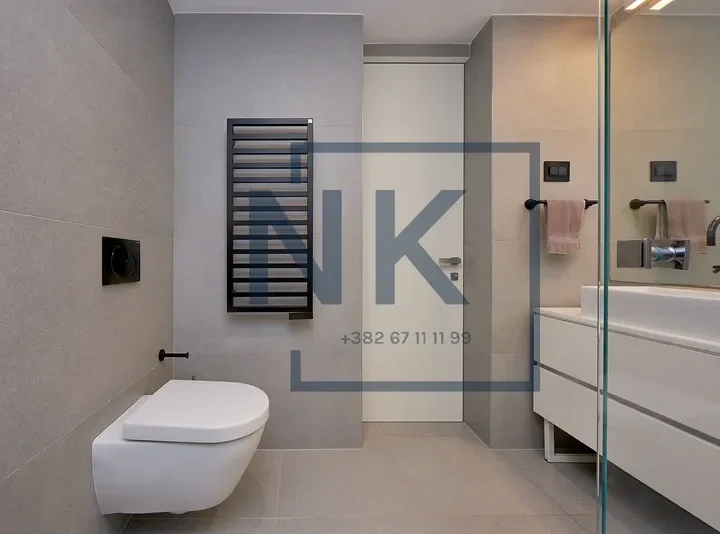 Stan je dizajnerski uređen, opremljen sistemom pametne kuće, split sistemom za grijanje i hlađenje, podnim grijanjem u kupatilima, kao i visokokvalitetnim duplim kliznim prozorima koji doprinose komforu i energetskoj efikasnosti.