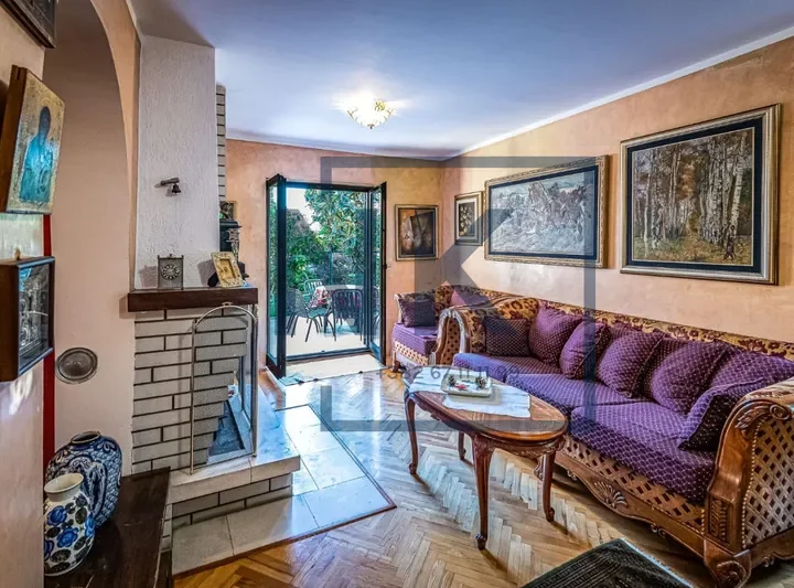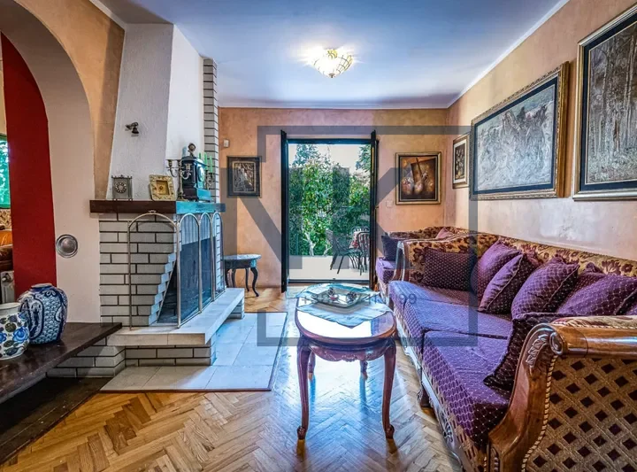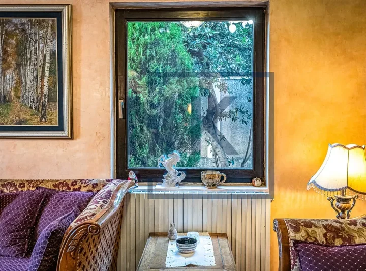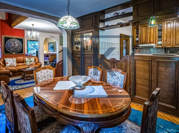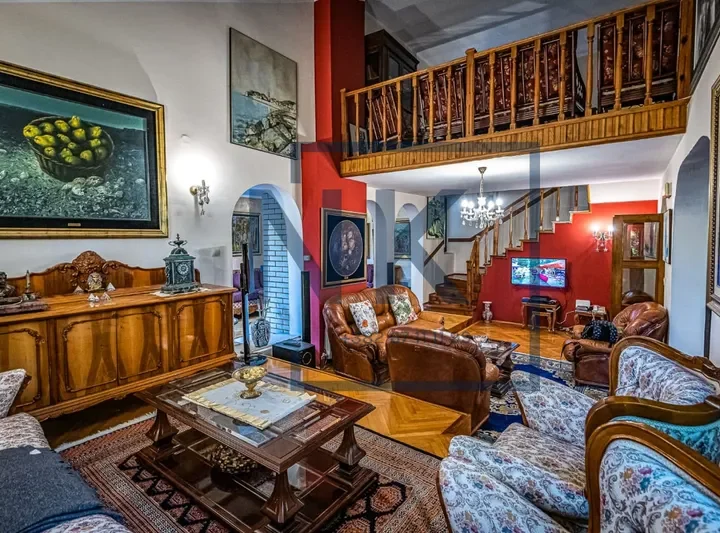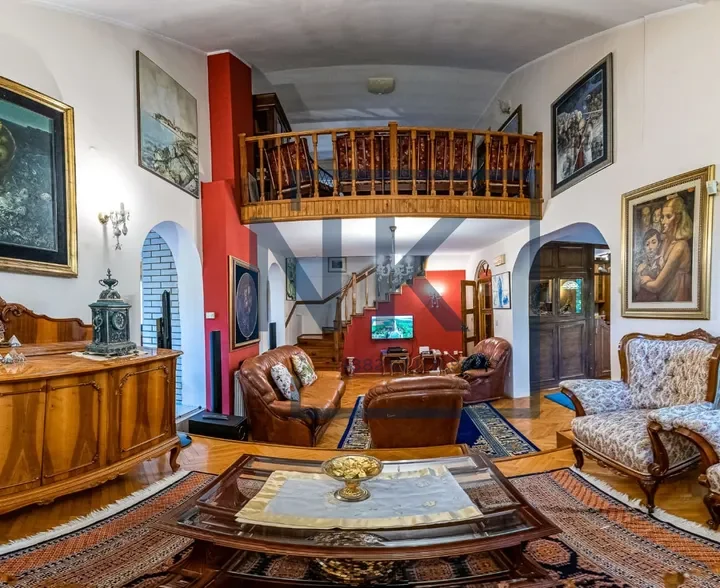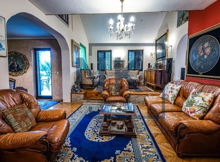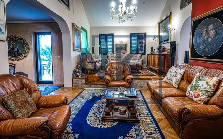 Enterijer: Dizajnirana je za porodično ili rezidencijalno stanovanje, unutrašnjost kuće je opremljena stilskim nameštajem, raznim umjetninama i prekrasnim parketom od punog drveta. Dnevni boravak odiše toplinom i luksuzom, s kvalitetnim namještajem, umjetničkim slikama i detaljima koji stvaraju sofisticiranu atmosferu. Drveni parket visokog kvaliteta i stilski odabran namještaj pružaju osjećaj domaće udobnosti.
