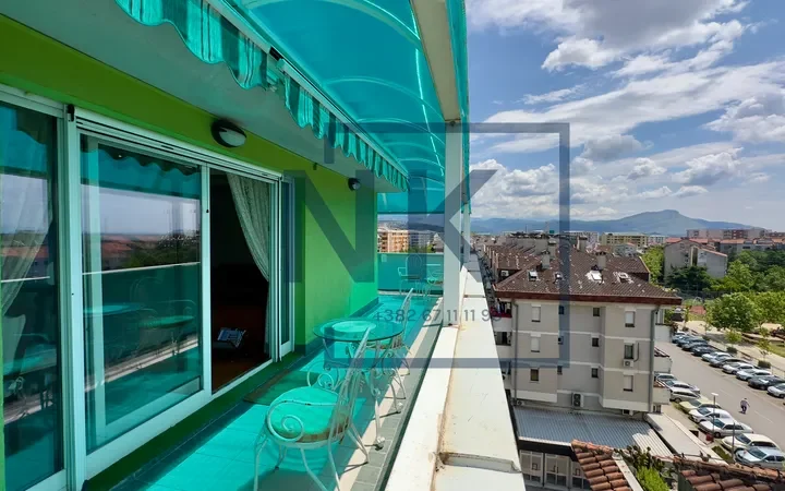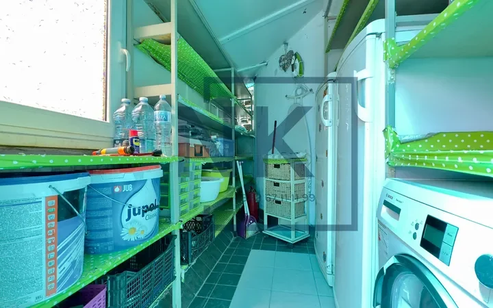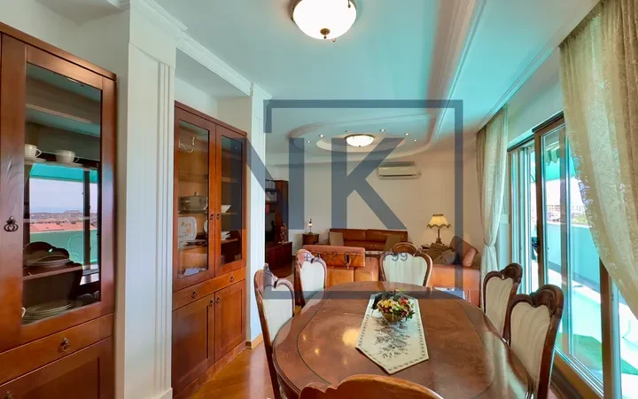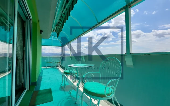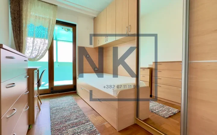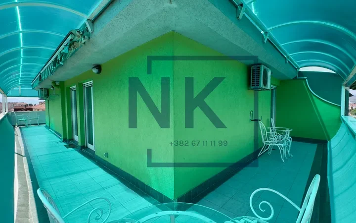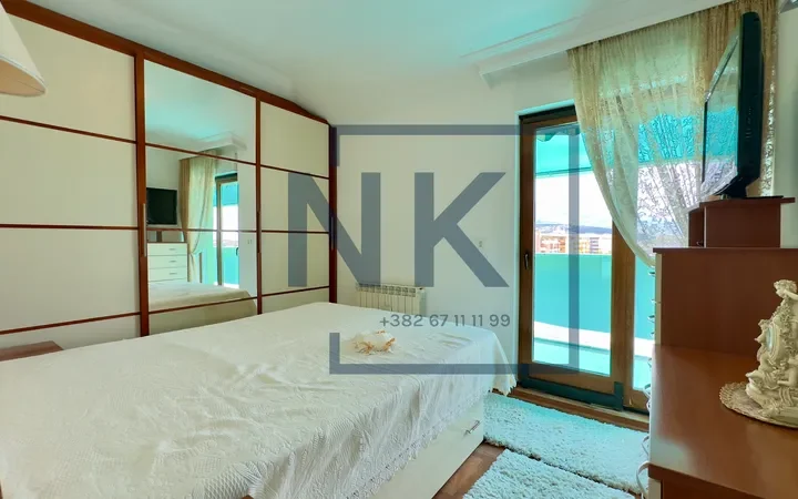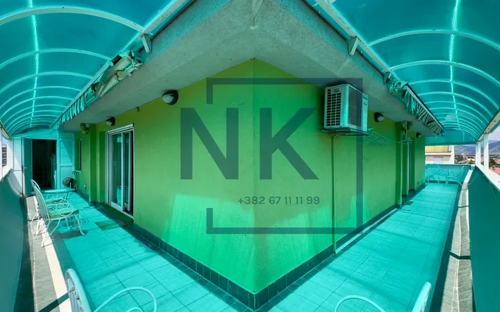 Stan je trostrano orijentisan i izuzetno svijetao, sa prostranom terasom koja okružuje cijeli stan i pruža otvoren panoramski pogled. U sklopu terase nalazi se funkcionalna ostava sa dodatnim frižiderom, zamrzivačem i mašinom za sušenje veša.