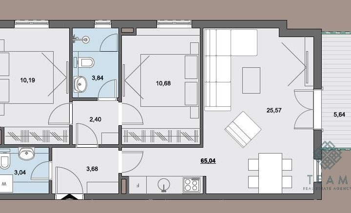 Struktura stana obuhvata: prostrani hodnik, dnevni boravak sa trpezarijom, kuhinju, 2 spavaće sobe, kupatilo, toalet i terasu.