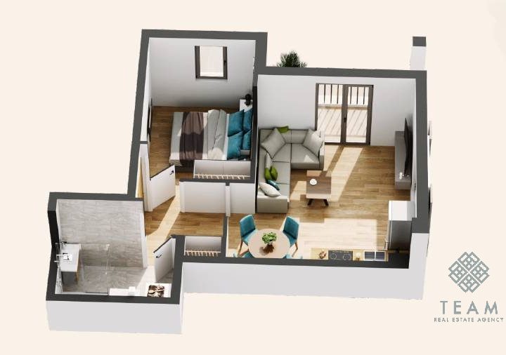 Struktura stana obuhvata: ulazni hodnik, dnevni boravak sa trpezarijom, kuhinju, spavaću sobu, kupatilo i terasu.