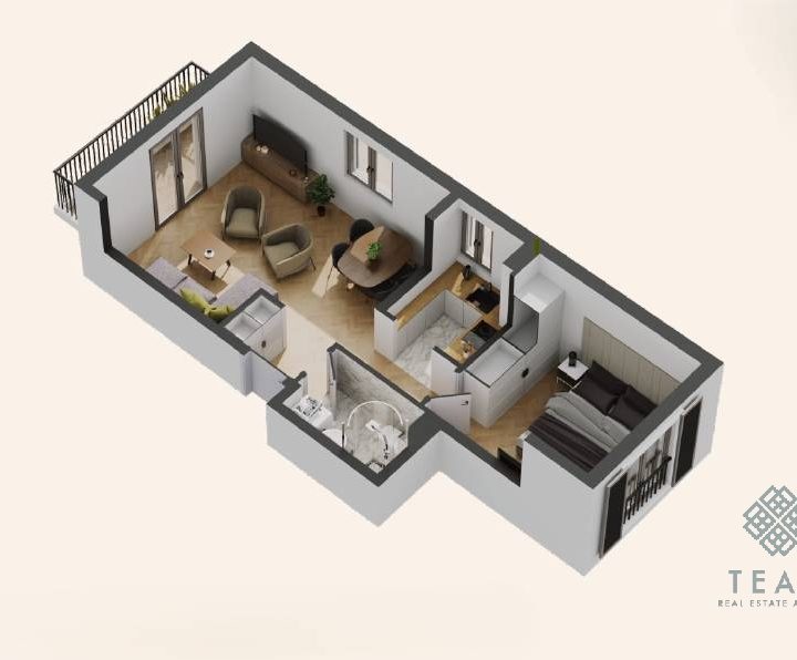 Struktura stana obuhvata: ulazni hodnik, dnevni boravak sa trpezarijom, kuhinju, spavaću sobu, kupatilo i terasu.