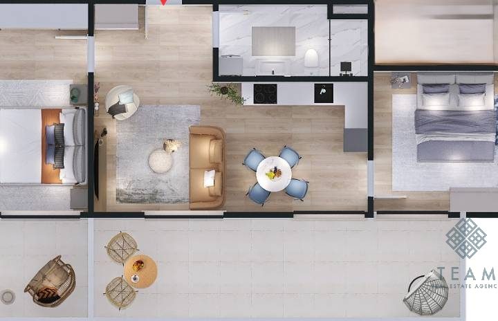 Struktura stana: dnevna soba sa trpezarijom, kuhinja, spavaća soba, kupatilo i terasa.