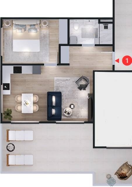 Struktura stana: dnevna soba sa trpezarijom, kuhinja, spavaća soba, kupatilo i terasa.